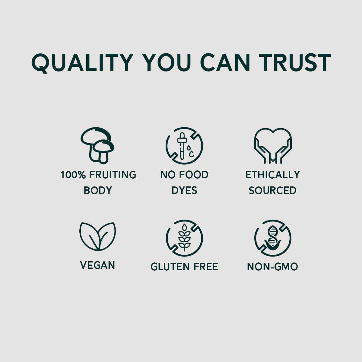 We're committed to quality and transparency. Our mushrooms are all sourced in the USA from reputable producers and are made with 100% fruiting body extract for maximum benefits.